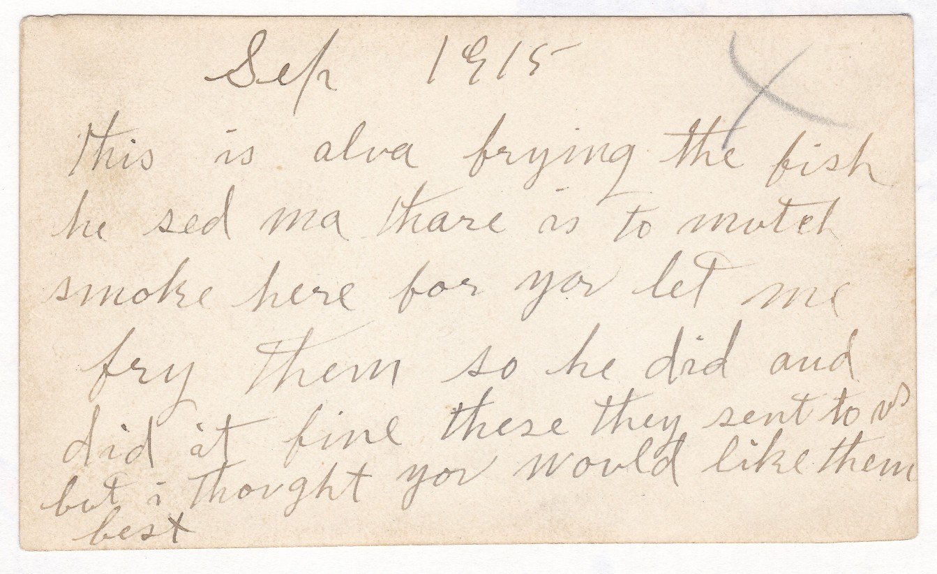 “Sep 1915 this is alva frying the fish he sed ma thare is to mutch [said ma there is too much] smoke here for you let me fry them so he did and did it fine these they sent to us but i thought you would like them best”