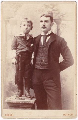 Shall we assume we’re looking at a father and son? It’s an affectionate pose. To my inexpert eye, the man’s outfit seems fairly conventional for the day, but then there’s the boy. Not only is it sweet to see him perched on a pedestal (with what appears to be a posing stand behind him), but he’s wearing an adorable high-waisted jacket with big white cuffs and a white back collar, a big bow, short pants with boots and leggings, and what looks for all the world like a curtain sash around his waist. While elements of this are things I’ve seen in other pictures, the overall look is unusual to me. This is a cabinet card with no information besides “Beebe” and “Denver” printed on the front. As for Beebe, it seems that’s John E. Beebe, who began his photography career in Chicago before relocating to Denver, where he stayed about ten years before moving elsewhere and becoming a physician and later going into advertising. Various references indicate he was in Denver in the late 1880s and early 1890s, a date range that would appear to correspond with this image.
