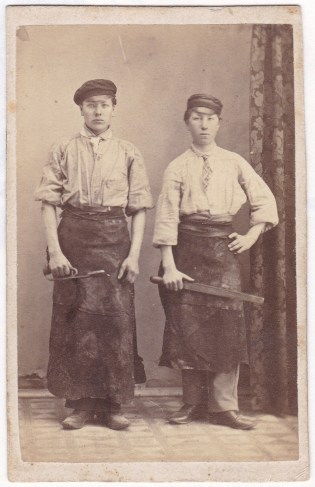 Here’s a little carte de visite I just got. I’m not sure why, but I’ve always loved photos of that era showing people in a largely empty studio basically standing there, framed in full length. And this one is probably my first occupational photo of that type. But what is their occupation? The aprons resemble those worn by, say, blacksmiths, and I’m guessing the tool on the right is a file. But I’m stumped by the tool on the left. Any suggestions? (I’m sure it will seem obvious once I find out.) Also, there’s no information on the photo about who they are, or the name or location of the photographer. Still, I’m happy with it.