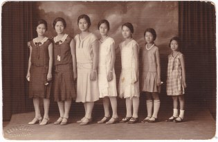 This is a real photo postcard. The manufacturer’s markings (AZO with corner squares) indicate a rather broad date range of about 1925 to the 1940s. It has an interesting textured finish that you can see in the enlargement. The photographer’s name (Nueva Studio / Cabanatuan) is embossed in the lower left. And that’s all the information I have about this image. I don’t know who these people are, and can only make guesses about their relationships to each other. Is there any significance to the fact that dresses #1 and #2 are nearly identical? Shall we read anything into the fact that they are all in physical contact with each other, except the girl on the far right, who is standing a bit apart and appears somewhat disengaged? So much about this photo seems rather conventional, and yet, from my perspective here in California, they are far away overseas. So this photo feels both familiar and foreign, which I find interesting.