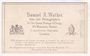 This little carte de visite caught my eye because of the unusual garments, the introspective pose, and that imposing face. Somebody wrote “Bp Chichester” on the back, which made it easy enough to do a search and figure out that this was The Right Reverend Richard Durnford, who served as the Bishop of Chichester from 1870 to 1895, when he died at age 92. (See info here.) The photographer, Samuel A. Walker of London, promotes himself as “Fine Art Photographer To The Queen, Bishops & Clergy”, though noting that he also photographs “Ladies, Children, and Laymen”. Imagine what it must have taken to build a clientele like that. [click below to view the back]