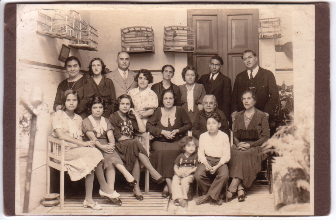 I assume this group of 16 people is a family portrait. Interesting group of faces. I like the setting, what appears to be a back porch or some other sunny area of a house, with five birdcages overhead. I enjoy trying to guess the location. I’m guessing somewhere Mediterranean or in southeastern Europe, but that’s just a guess. The doors look European, the people don’t strike me as, say, Nordic, and the birdcages suggest a warmer climate. But who knows. Any ideas?