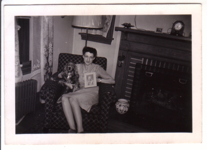 Since I know nothing about this photo, all I can do is guess. I’m guessing it’s a World War II era photo, and American. I’m guessing the man in the portrait is not around, though the woman’s smile suggests he is alive. I’m guessing she’s his girlfriend or fiancee. Maybe wife? (Maybe sister? Maybe demented stalker?) My best guess is that this picture was taken to send to him overseas, assuring him that he has a loved one back home who is keeping the home fires burning (figuratively, if not literally).