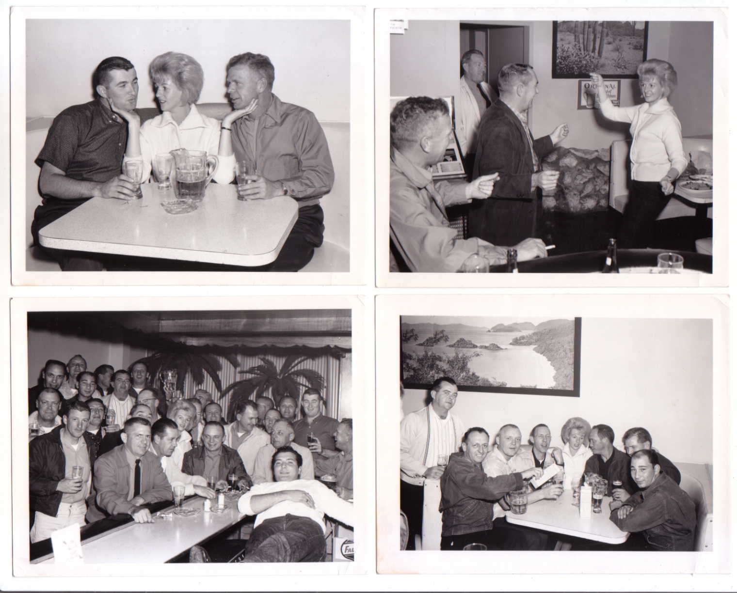 I have eight snapshots of this scene in some bar. Six of them (including the four shown here) depict a blonde gal whooping it up with a bunch of guys. Except for an older woman tending bar (in a photo not shown here), she is the only woman. The layout is such that if you are standing behind the bar serving drinks, looking straight ahead, you’ll see the booths with formica tables. If you look to your right you’ll see the wall with the palm trees. And if you look to your left you’ll see the jukebox. I love the faux-tropical decor, though the desert cactus picture behind the dancing lady is a bit incongruous. (The sign below the cactus picture is for Pabst Blue Ribbon.) I don’t know the story here. Is this a party, or did someone whip out a camera on a regular night? The table behind the dancing lady has plates of food as well as paper that might be used wrapping paper, and a table not shown here has an item wrapped in foil. In the fourth picture, what is the man on the left handing off? Whatever the situation, it seems like everybody is having a grand ol’ time.
