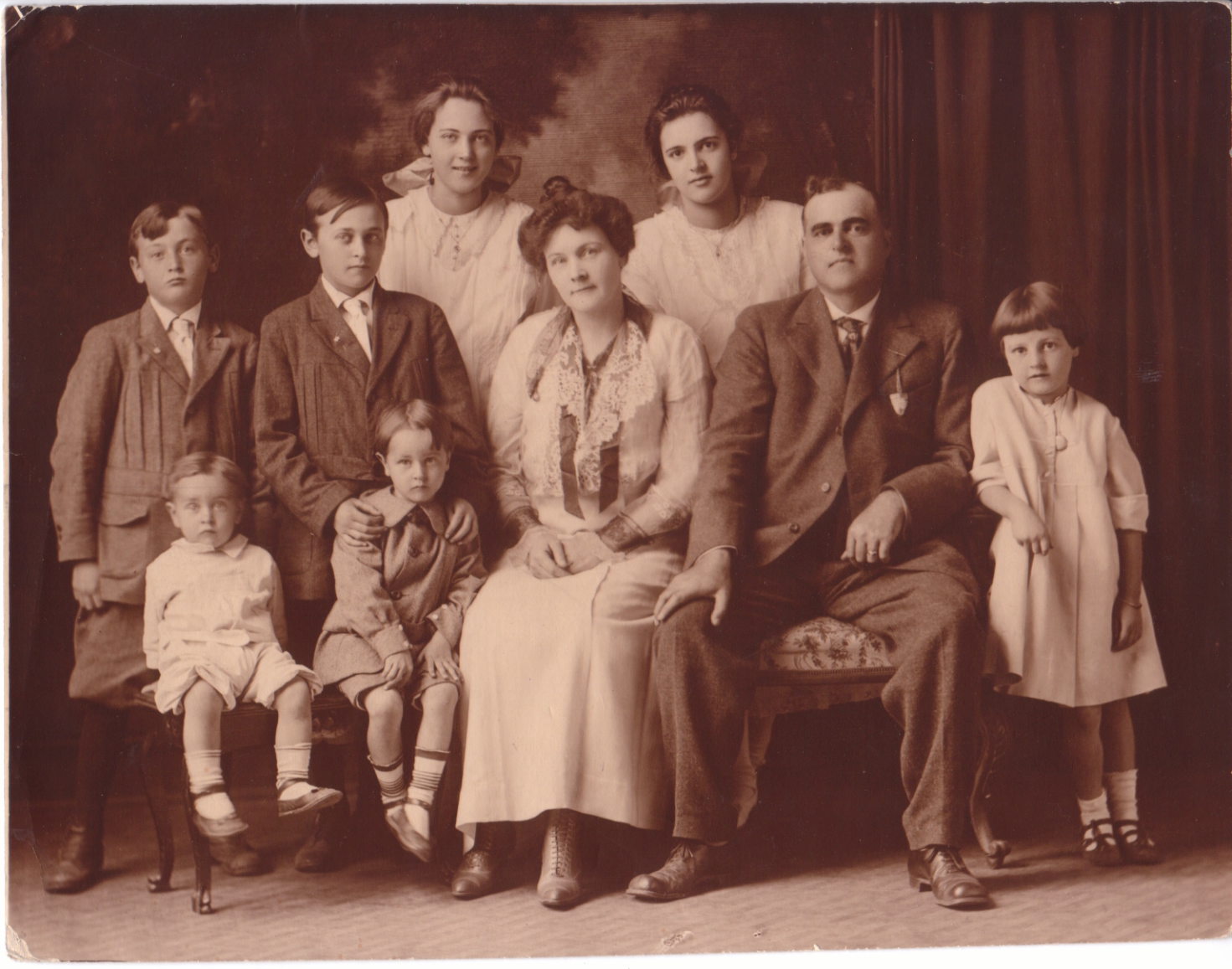 Some photos I have of large families show parents who look rather spent, but these two look like they are holding up well. I’m not sure what is on the man’s jacket, something pinned to and hanging from his lapel. Some sort of medal? At first glance, the two sets of older boys and girls seem to be identically dressed, but the girls are not. The two older boys are wearing tiny matching flowers on their lapels.