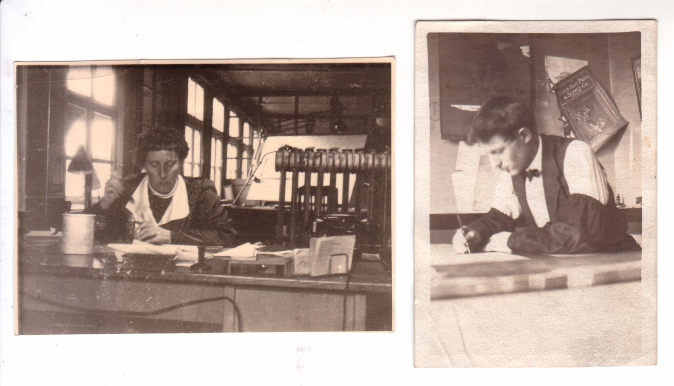 In honor of Labor Day, here are a couple of pictures of people at work. I’m not sure where that woman works or what sort of apparatus that is behind her desk. I like the man’s protective sleeves. And while I don’t know if it gives any indication of his location, the posters on the wall behind him are for Southern Art Glass Co. and Texas Blue Print & Supply Co.