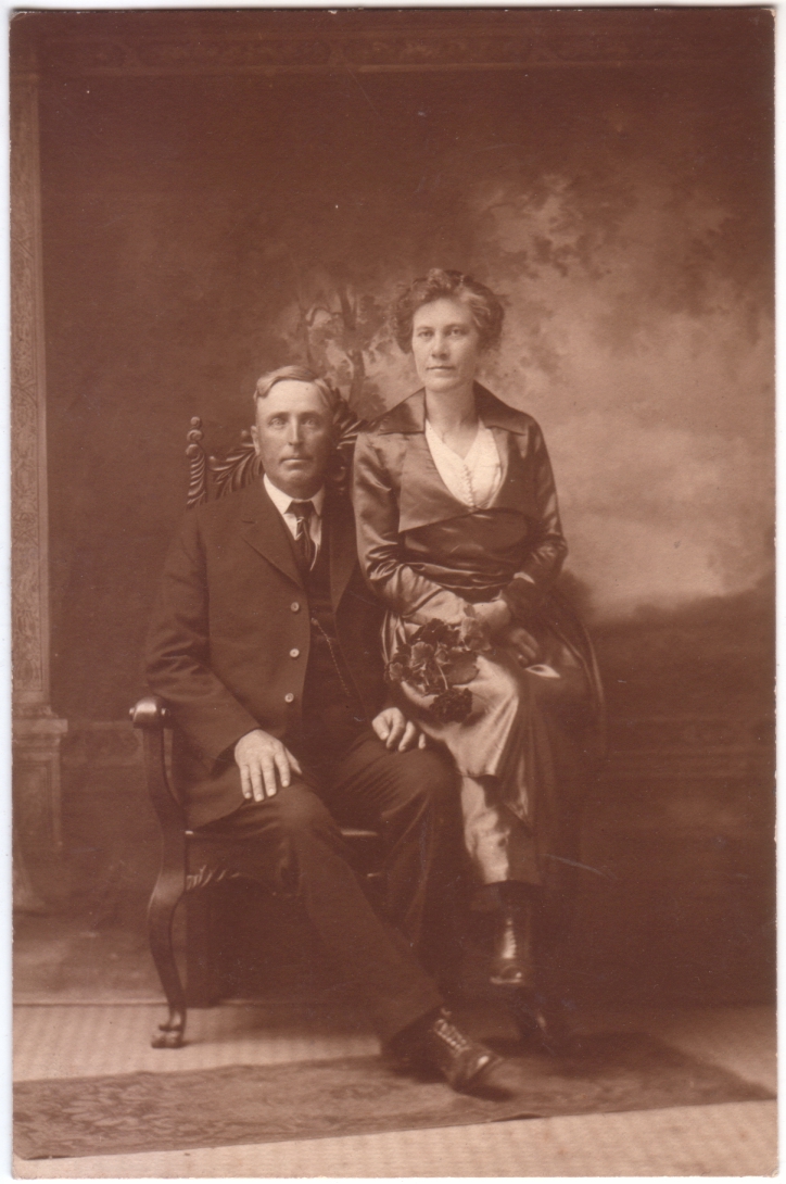 Some of the people in my photos look like they are afraid that the camera will steal their souls. But others, like this couple, look like they are perfectly at ease getting dressed and posing for a photographer. Though it’s clearly a studio photo, it seems simple and stately, not fussy, and her flowers are a nice, quiet touch. This is a variation on the theme of the man enthroned and the woman ready to hop to his service, but at least she’s granted the opportunity to perch on the arm rest. A handsome photo of a handsome couple.