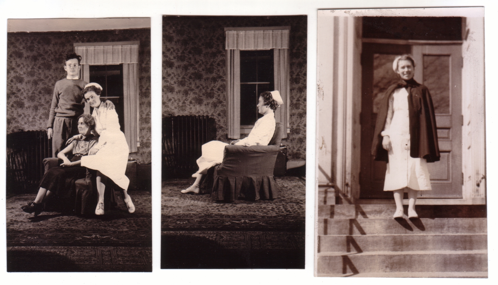 As someone with a background in theater, I was delighted to come across the two photos on the left, which appear to be from a vintage amateur stage production.  (I have no idea what the play might have been.)  The woman playing the nurse appears in other snapshots that I have, including ones showing her lounging around for the camera in rather actorly poses, as if these snapshots taken in some living room were intended for publication in a fan magazine.  It’s actually rather charming.  The two above show her in action, treading the boards, which makes me happy.  And just for good measure, even though it’s a bit blurry, I’m tossing in a photo of a real nurse, too.  I love the cape!