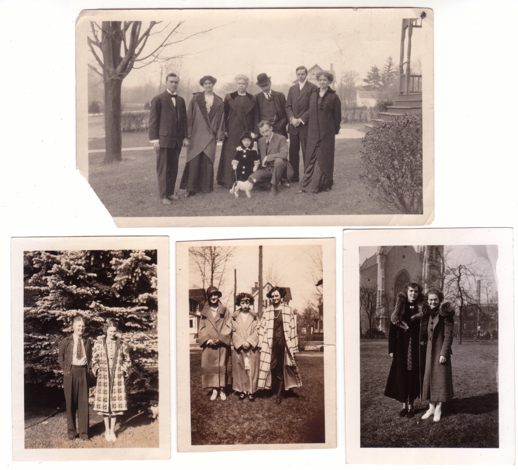 I’m going to take a risk and guess that the center-bottom photo is circa 1924. I’ve found a few similar styles of coats in the 1924 section of my book of Sears’ catalog styles of the 1920’s, as well as an industry catalogue for coats from 1924. (That I found in someone else’s blog of ephemera.) Anyone have other ideas?