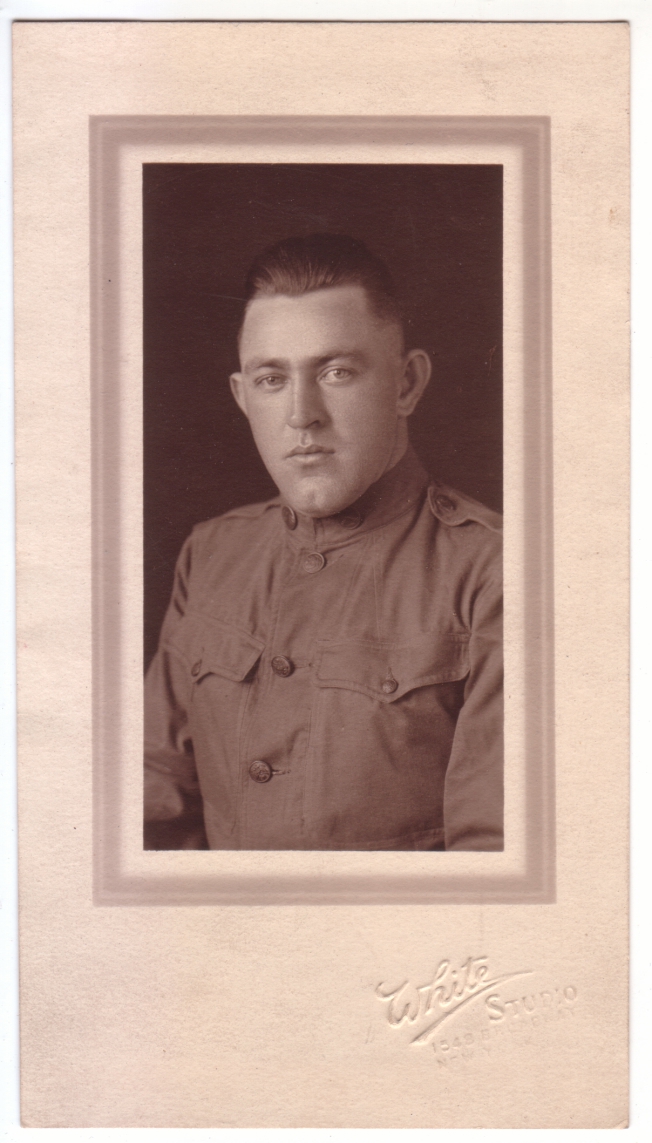 I try to mix things up with this blog, to post photos of people of different ages and genders, individually and in groups, studio portraits and snapshots, different time periods, etc. It’s just my effort to accommodate the different interests of the people who might be reading it, and to provide variety as a way of avoiding monotony (for my own sake if nothing else). So after a weekend of nurses and pretty coats, I figured it was time for a man. And not just any man, but a strong, lantern-jawed man in uniform. I love this guy because he seems like a decent, handsome guy, but his look almost crosses the line into caricature for me. Unlike some of the people in uniform whose pictures I have that were taken by small-town studios, this guy could almost be from anywhere, since half the world seems to pass through New York City at one time or other. Maybe he’s from Upper Podunk and got his picture taken before shipping off overseas, or maybe he spent his whole life in Manhattan. I just don’t know. As for guessing the date, I think he’s wearing an Army tunic in a style circa WWI, but I’m not sure how long that style was around.