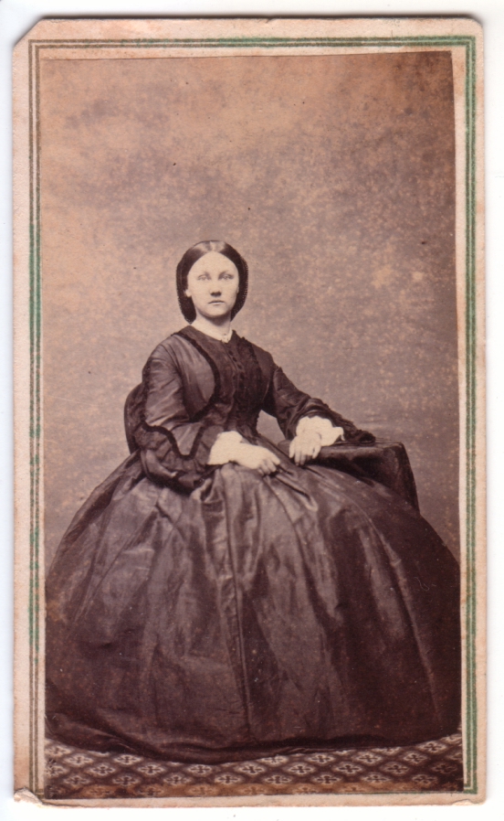 2. This CDV shows a gorgeous example of Civil War dress, with the dropped shoulder, pagoda oversleeve with white undersleeve and cuff, and the very simple yet luxuriant trim of dark velvet ribbon with ruffles on the bodice. Her hair is neatly parted and netted in back. This would probably have been about 1862-64; she wears no jewelry, watch chains, necklaces or earrings that I perceive. Holding a pose for a photo then is a challenge; but I also do think that the early photographers were probably more ‘artistic’ than we often credit. No doubt they felt the gravity of recording their subjects images. And these days, we may look ‘happy’ in our photos, but do we really look intense?