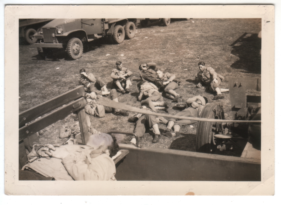 Thanks! I’ve been operating under the assumption that the photo was taken from the back of some sort of troop transport truck, that the strap across the center of the photo was to keep people from falling out, and that the guy in the foreground was lying on a bench. But I’m happy to hear if somebody has a better idea.