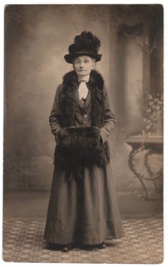 1. I love your attitude–and she is quite lovely. I have some similar photos and I would date this one as closer to about 1912/15, rather than the earlier possibility. Fur stoles and muffs were apparently quite popular at that time–I have many photos where they areaccessories. And it is also quite common to see the older generation of any give time period, wearing slightly out-of-date clothing, in her case, harking back to at least 10 years prior. Keep up the fun photos! You are inspiring me to continue scanning my own collection and tyring to organize it.