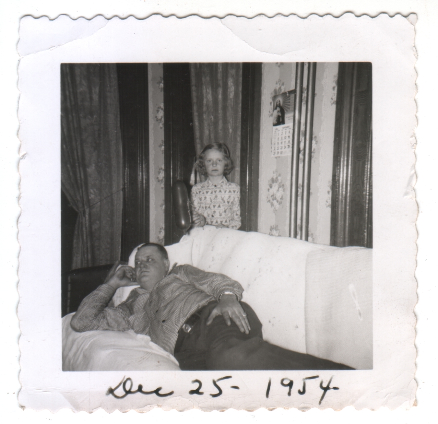 Okay, I couldn’t resist a little sarcasm in using that song title as the title of my post, but even as somebody who likes Christmas, I find it a little over the top.  And this photo cries out for the distancing effect of humor, since it’s so pathetic it’s almost funny already.  Even though it’s the same date as my post from two days ago, it’s a got a completely different feel (and is, I believe, an unrelated household).  This poor little girl is waging a valiant battle against the forces of ennui, wielding her limp balloon in an attempt to infuse a little holiday cheer into the situation, but even she doesn’t look convinced.  I keep hoping that the slug on the couch isn’t her father, but a wayward uncle or something, the couch covered in anticipation of his dissipated occupation of it.  I remind myself that this is a single photo, an image taken out of context, and that this may indeed have been a wonderful Christmas celebration that just didn’t photograph well in that moment.  But then I notice that they haven’t even bothered to change the calendar over from November.  *sigh*  Don’t worry, cheerier photos for the rest of the week.  🙂  (By the way, ignoring the content for a moment, I also happen to like this photo for its visual composition.  I like the way the lumpiness of the man matches the lumpiness of the couch, the way the couch’s edges form a point that direct our eyes to the nicely centered girl, and the way the man and couch form a horizontal base for the vertical lines of the windows, pipes and door.  Just staring at the lines of the image, it dissolves into an abstract set of intersecting shapes and patterns for me, like a Diebenkorn or something, if that makes sense and doesn’t sound too naive.)