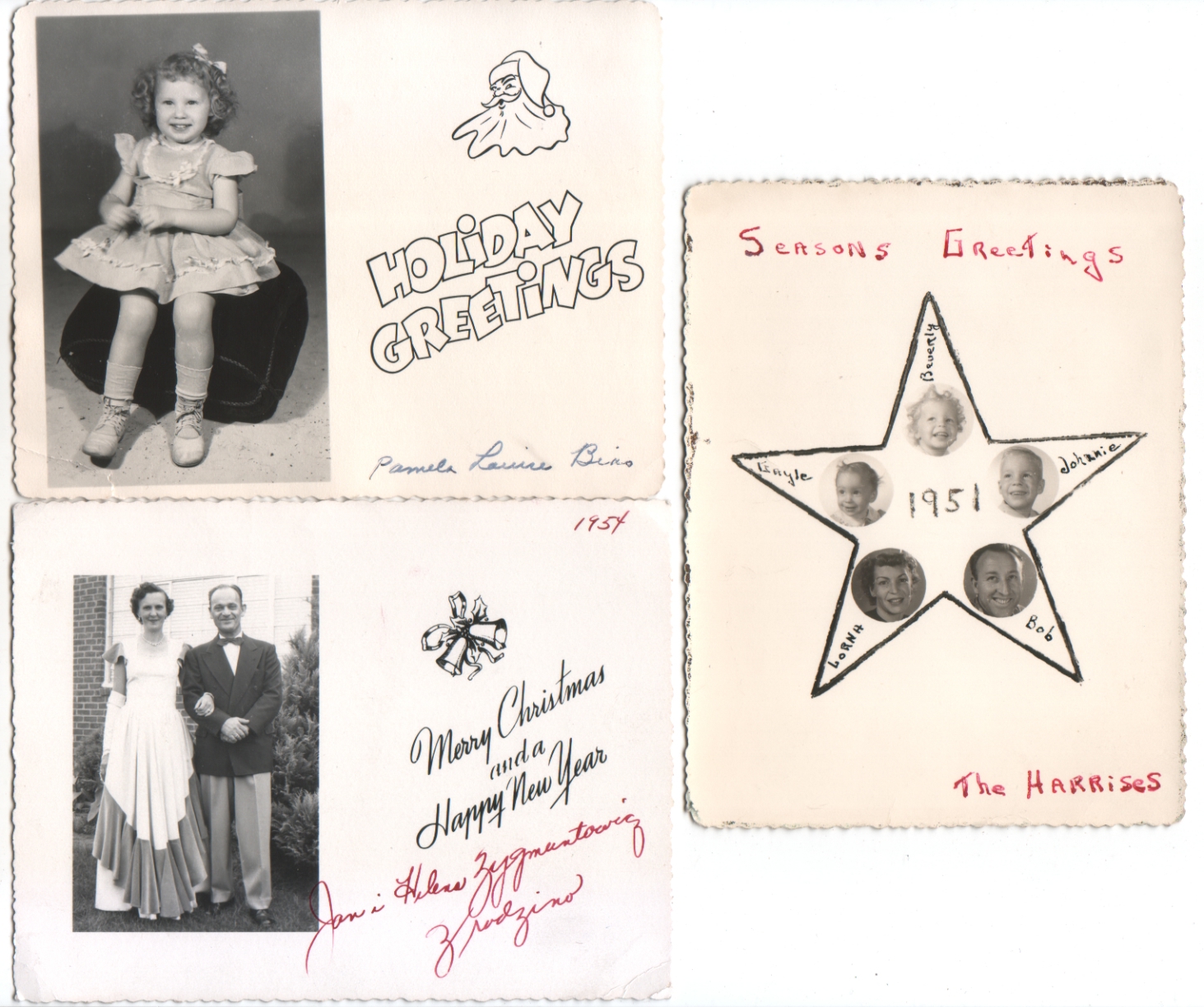 Top left:  Signed Pamela Louise Bins (I think).  Bottom left:  Dated 1954, signed Jan i Helena Zygmantowicz Zrodzino (“i” is Polish for “and”).  Right:  Dated 1951, identified as the Harris family, father Bob, mother Lorna, and kids Gayle, Beverly and Johnnie.