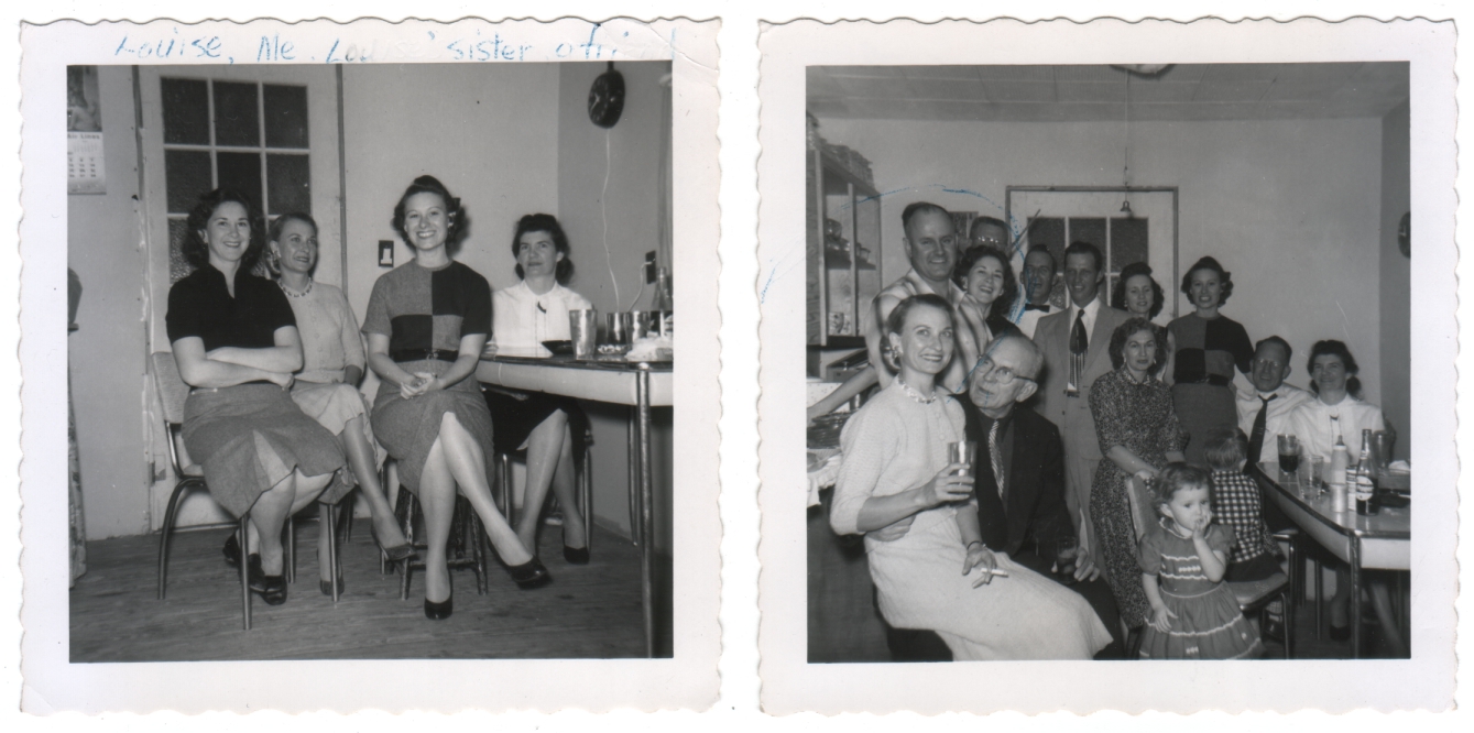 Handwritten identifying information on the back is obscured by mounting traces (glue and album paper), but this is the best I can do for now. Left photo: written on the front is Louise, Me, Louise’s sister, a friend and on the back is New Year’s Eve – Louise, Yours truly, Jean Sca[?]y, & Edith Hodges. Right photo: written on the back is Some of the guest [sic] at the Jackson’s New Years Party. In the corner is Louise, Henry [illegible] in front, I’m [illegible] the man’s lap. [illegible] girl is Louise’s [illegible].