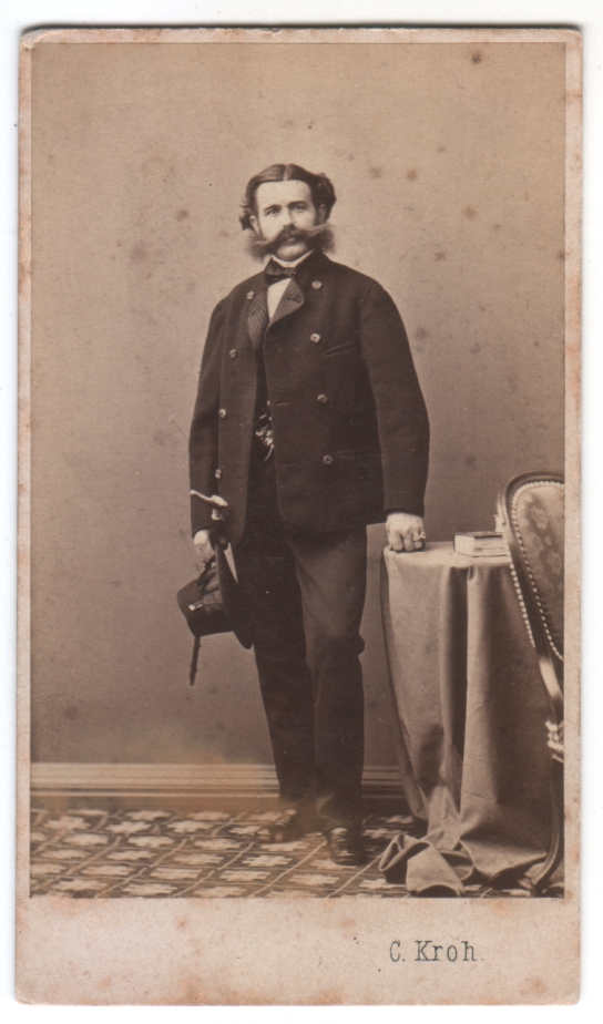 Venturing once again to 19th Century Vienna, we find this barrel-chested man with a mane of hair and a glorious mustache, proudly surveying what lies before him. Yes, he makes nods to fashion with rings on his fingers and a jacket whose buttons are decorative to the point of caricature, but his vaguely Tyrolean hat suggests his love of the outdoors, and he appears robust enough that surely the walking stick is a mere accessory. The tablecloth appears kicked away, the token book ignored. And the chair? No, sir, I shall stand, thank you very much.