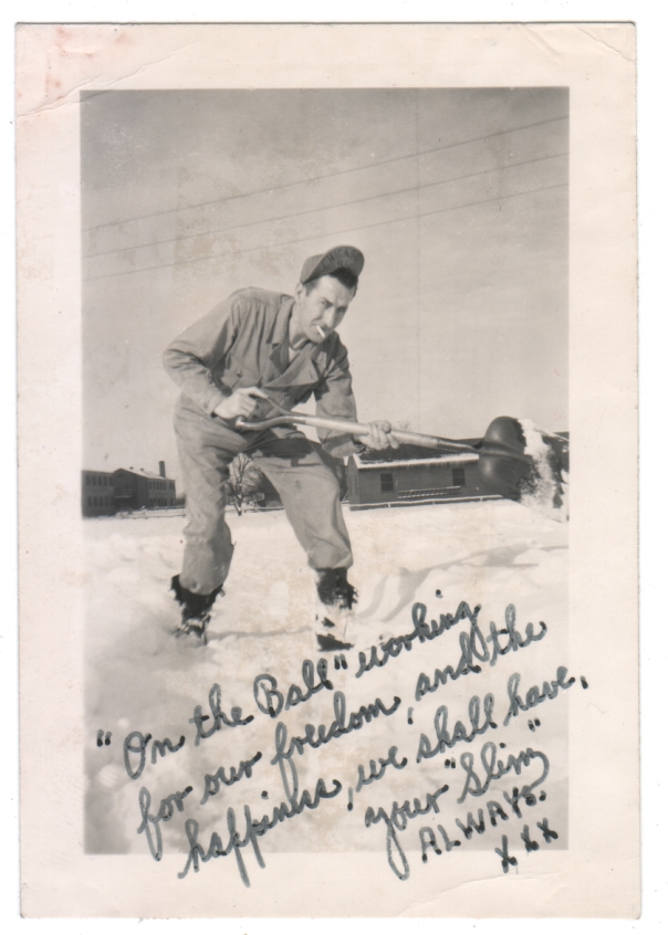 No date or formal identification, but this is “Slim” of Bert and Slim.  You can probably read the handwriting, but it says:  “On the Ball” working for our freedom, and the happiness, we shall have, your “Slim” ALWAYS XXX