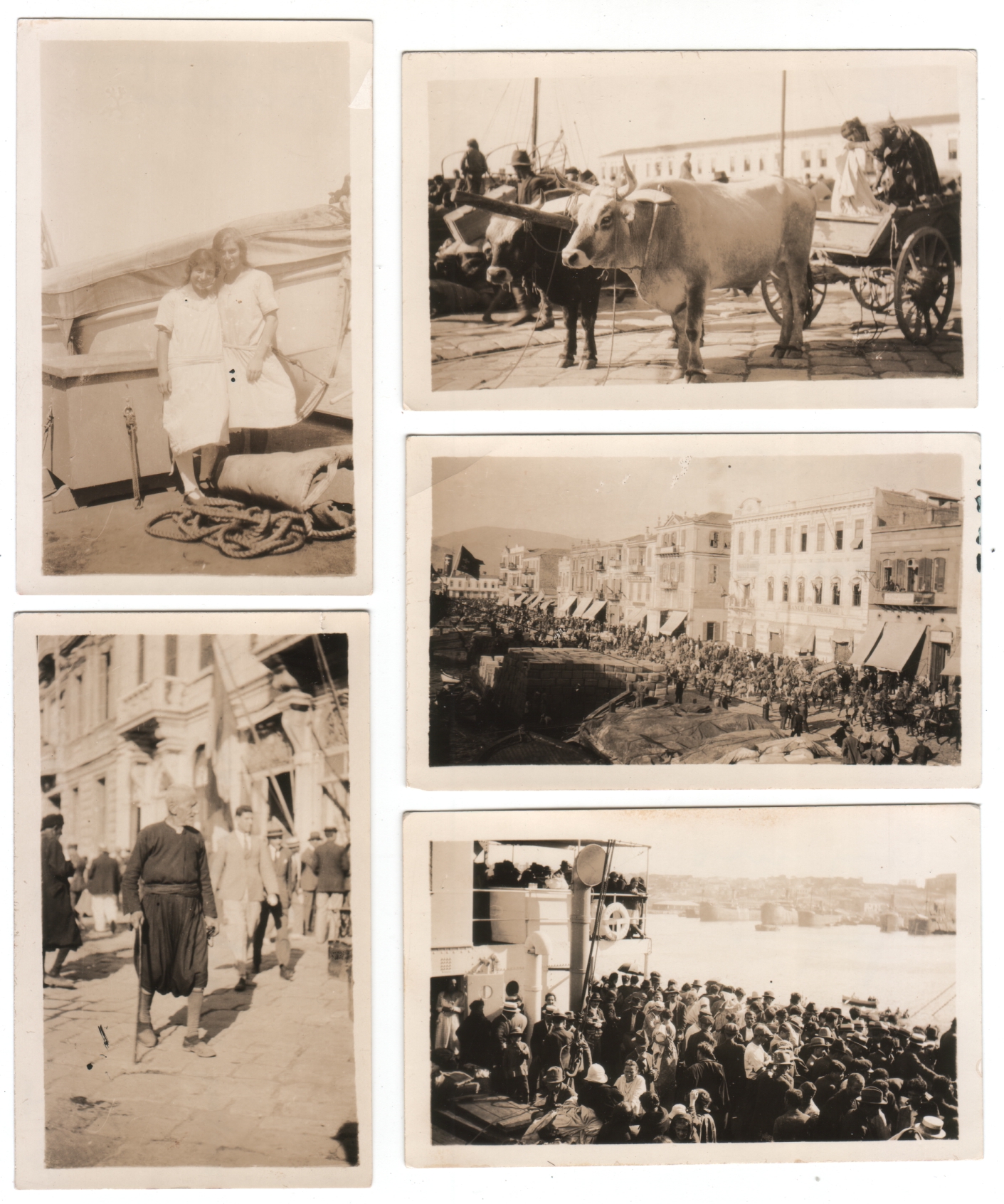 These are from among what I believe to be photos of a vacation to Greece, with men posing at the Parthenon and other cultural tourist spots. The five pictures shown here appear to just be more of the same, with shots of their crowded boat, busy ethnic street scenes, and even a couple of pretty girls on the boat. But then I read the captions on the back and was startled by the drama being depicted. These photos aren’t dated, but the Greeks occupied Smyrna (present-day Izmir, Turkey) from 1919 to 1922, when they were rousted by the Turks. Since the captions indicate the photos were from just before and just after the Turkish army entered Smyrna and took back control of the city, these photos can apparently be dated to early September 1922.