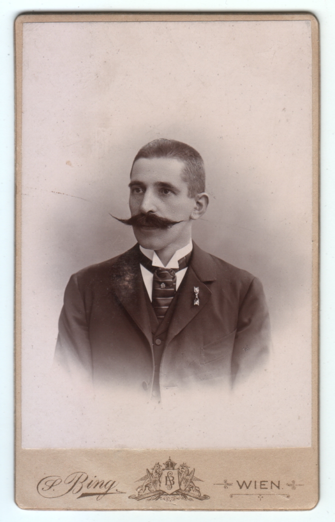Here’s another man from Vienna with glorious facial hair. It’s curious how much care he puts into growing and grooming his mustache when the rest of his hair seems to be such an afterthought. It’s also interesting that he has chosen to let the mustache operate solo without support from a beard or sideburns. I’m intrigued by the pin on his lapel, and wonder if it signifies something. (By the way, the discoloration on the other lapel is just damage to the photo.)