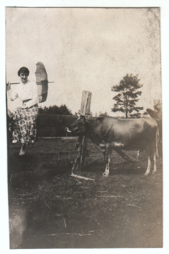 There’s an passage in Mary Roach’s amusing book Spook where she takes time out from her investigations into the pseudo-science of the paranormal (the main topic of her book) to conduct a casual experiment into the curiosity of cows.  She lays down in a field of cows and waits to see what happens.  Sure enough, the cows hustle over and stand around her, staring at her, sniffing at her, etc.  She said it’s the strangest sensation to be lying flat on your back in a field while giant beasts crowd around you and gently examine you.  I’m sure our young model here had no expectation of being visited when she perched on the fence with her pretty floral skirt and parasol, awaiting the camera’s adoring gaze.  But visited she was.