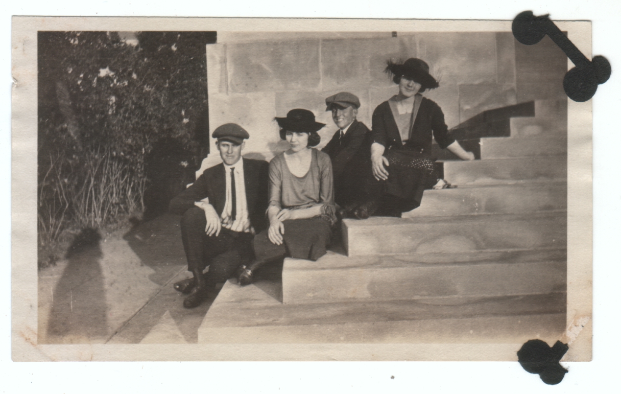 • Great comment! That hadn’t occurred to me, but I see what you mean. It’s the period of the clothes, of course, plus the way they somehow look like off-duty performers, a certain vivacious energy to them. Plus, since silent movie makers sometimes just took their cameras and actors out into the surrounding town and shot in real locations, sometimes without bothering to get permission, it makes sense that these might be four actors waiting for their scene on the steps of a bank or school building, capturing the last bright light of the day. I mean, I assume that’s not what’s actually going on here, but it’s plausible.