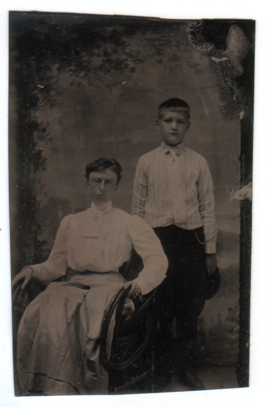 Here’s another history lesson for me.  Apparently in the early 1900s there were dozens of amusement parks across the country called Electric Park.  They were typically owned by the local electric company or the local streetcar company.  As far as I can tell, they called themselves the same thing without sharing corporate ownership.  (For instance, Disney theme parks around the world are all owned by Disney, but Electric Parks just called themselves the same thing without any formal connection.)  But I could be wrong.  In any case, there were several in New York state alone, so I can’t be sure which one this photo was from.  (A quick internet search on the photographer didn’t tell me anything.)  Meanwhile, there’s this tintype.  I chose to scan it without the paper frame because the frame was rather battered and because it obscured too much of the photo (the boy’s feet, the woman’s right hand, etc.).  I know smiles were rarer in old photographs, but man, they look like the amusement park’s charms are lost on them.  I’m also struck by the clothes.  I know, I know, people dressed like that then, and I appreciate that they are in their shirtsleeves and wearing lighter, summery fabrics, but I guess after months of staring at these photos for this blog it still sometimes amazes me what people had to wear in those days (the kid is wearing a tie!).  Imagine expecting people to dress like that today for an afternoon at Coney Island or Great America!