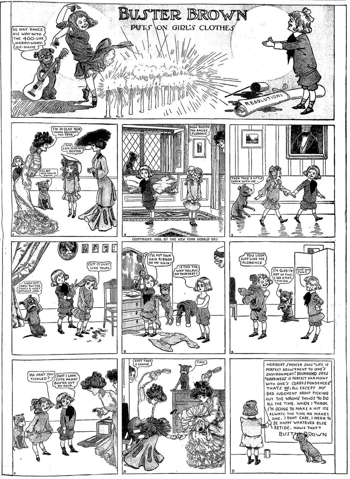 The clothing might seem girly to us, but the funny thing is, look at what happens when the boys and girls of 1903 really try to swap clothes (this strip actually belies the idea that only boys had side parts, and supports the idea that girls were more likely to wear hair ribbons, but knee pants speak louder than words, imo):