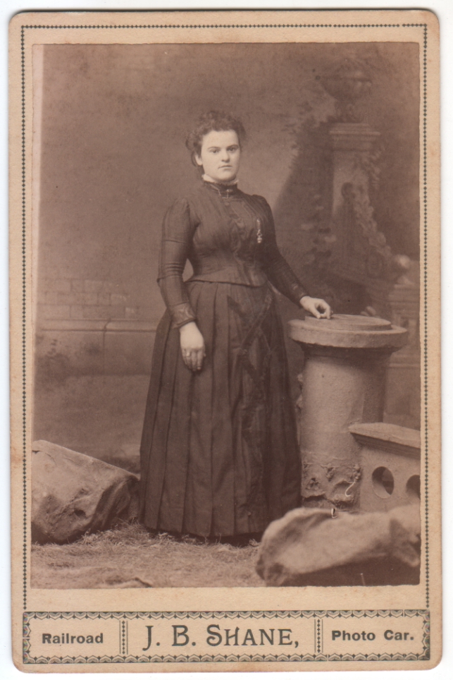 This was a new on for me, the railroad photo car.  I kept seeing those words on this photo and assuming it must have meant something else.  Surely not an entire photo studio on a train?   But I started looking around the internet in preparation for this post, and indeed, that’s what it turns out to be.  Traveling photographers were nothing new, it just wasn’t economically feasible in so sparsely and distantly populated an area as the Frontier West.  So entire rail cars were converted to photo studios, complete with darkrooms and living quarters, so that photographers, by special arrangement with the various rail companies, could travel around and take photos all along the rail lines.  If it weren’t labeled as such, I would never have realized that the romantic setting in which Jessie poses here was in a rail car, though given the presumably cramped quarters, I wonder how many options for settings there were.  There are plenty of examples of photos from railroad photo cars online, including ones by J. B. Shane, but I was especially delighted when a search turned up an example from over at Who Were They?, another vintage photo blog I already happen to follow (but started following long after this photo was posted).  And here is a very interesting article, complete with wonderful old photos, about the history of a particular railroad photo car.   Also, learning that there were actually photo studios on trains gives me more confidence in believing that a previous post of mine was indeed a photo taken in a studio on a boat.