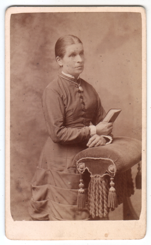 A reader comment a couple days ago wondered about the nature of the furniture in this post, and though I don’t know for sure, I think it might be designed for kneeling in prayer. So here above is an example of what I mean, sort of a “serving suggestion” for this piece of furniture, though the design is obviously more ornate, and we can’t see the whole thing to be sure what it looks like, or if our woman here is even kneeling. Though I’m only guessing what this photo depicts, the impression I get is more a woman engaged in pious reflection than a woman breezing through the latest novel. I’m kind of bummed about the damage, the spots on her face, but they are mostly visible in the enlargement, not so obvious just holding it in your hand, and I think she still comes through nicely. By the way, you can see other examples of this photographer’s work here, and the plate on the back of my CDV is the same as the third one, toward the lower right, dated circa 1880.