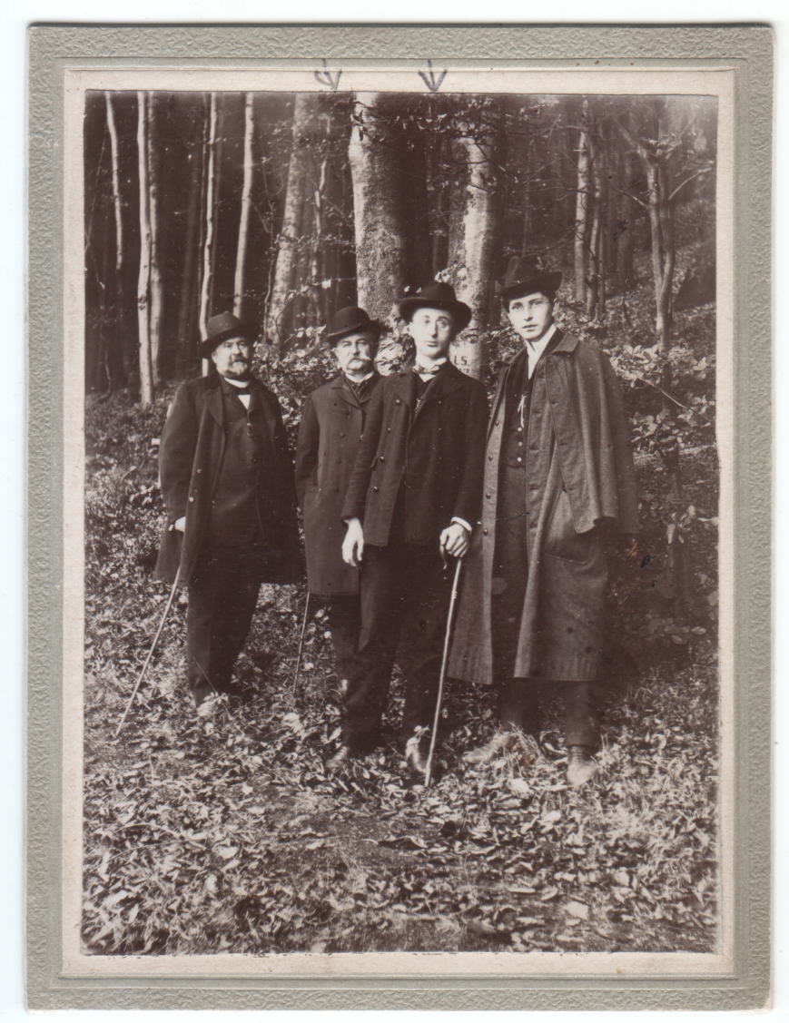 The man identified as “Dad” seems relatively young, so I’m guessing the handwriting was added some years after the photo was taken. Walking sticks aside, their nice clothes suggest to me they are out for an afternoon stroll through the woods rather than any strenuous mountaineering. Both of the young men appear to be wearing glasses, which in part made me wonder if they might be brothers. But maybe not, since why wouldn’t other close relatives be identified?
