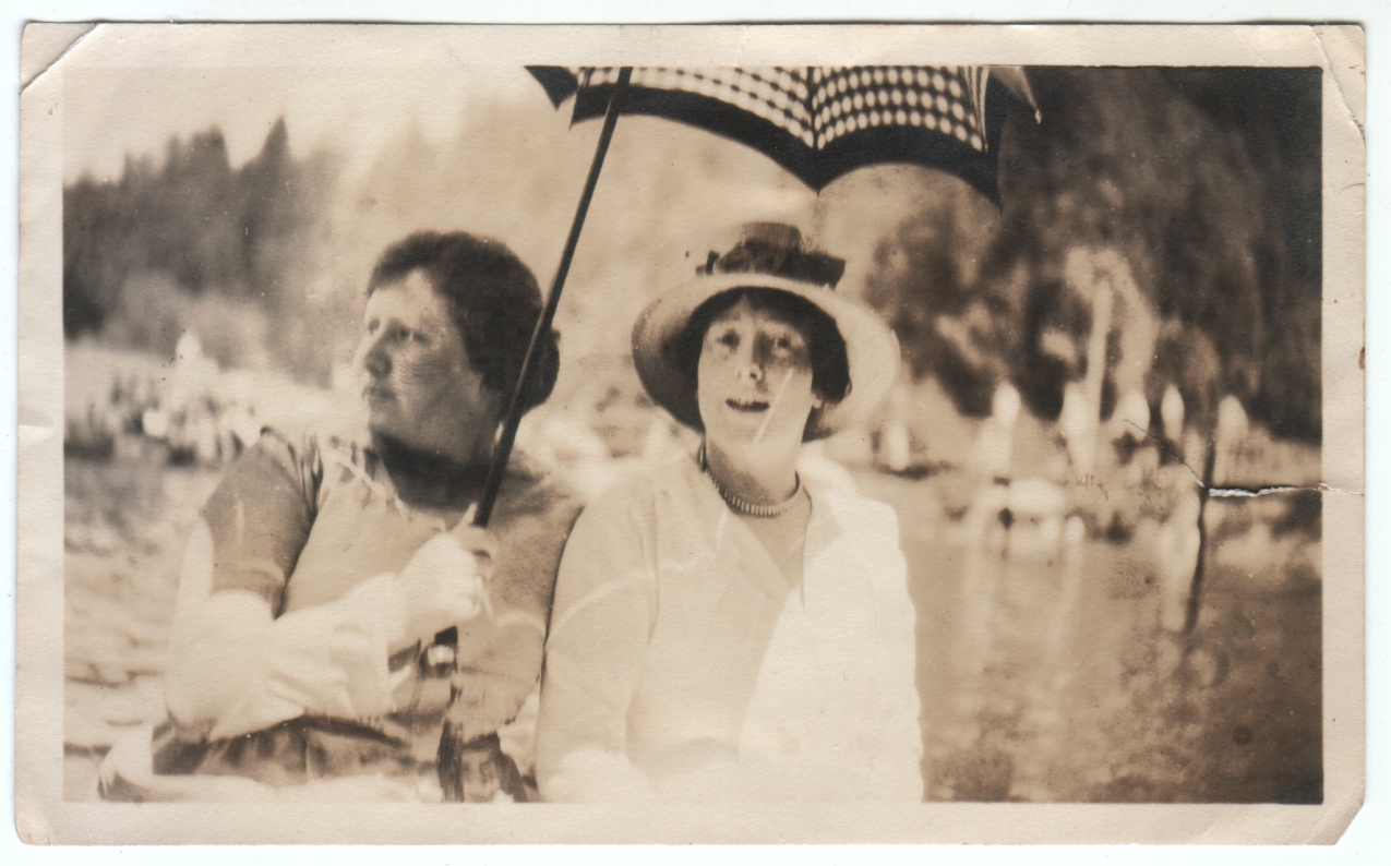 I go back and forth on whether this has a dreamy, soft-focus quality, or whether it is just blurry. However unintentional the focus may have been, I think it lends a romantic quality that enhances the setting. That seems to me to be a lake behind these women, though I can’t tell if they are sitting on shore or on some sort of boat. And while I thought the arm holding the umbrella was wearing a strange sleeve or long glove, I realize now it’s just the effect of the umbrella’s shadow. It looks like a very pleasant day.