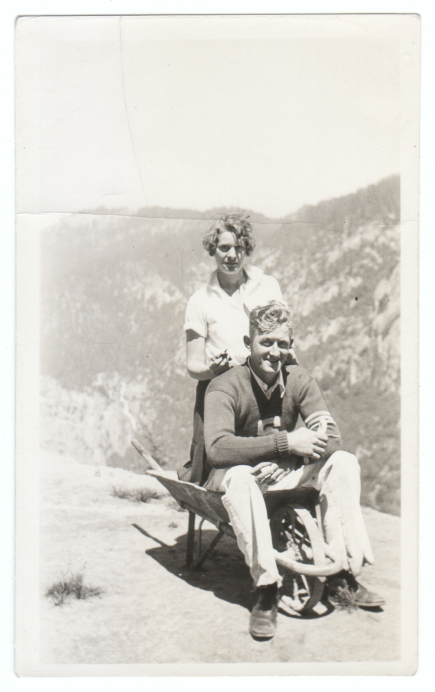 A woman, a man, a wheelbarrow, a mountaintop