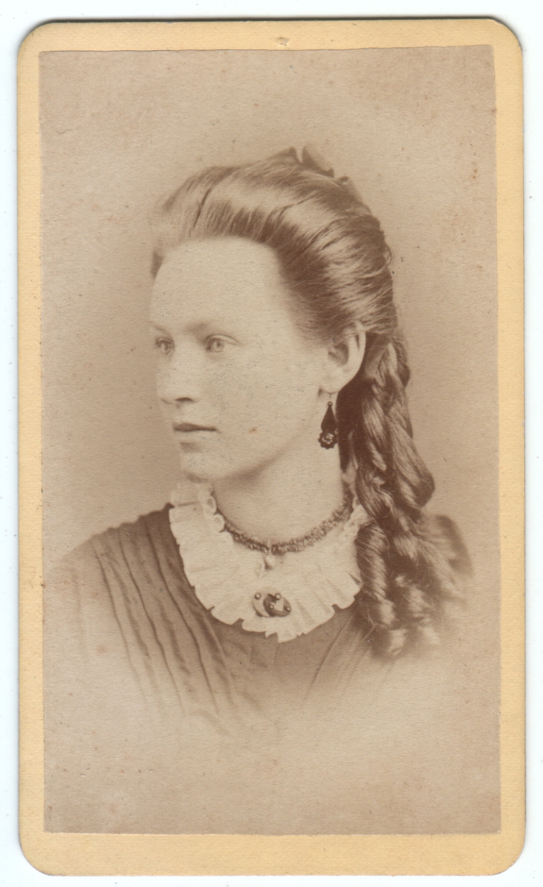 This is another one from what I’m calling the Wisconsin Album, for lack of a better term, since the photos I’ve been able to pull out (that aren’t too stuck in this fragile old album) have all been from Wisconsin or nearby.  Several have revenue stamps, dating them to the 1860s, and it seems they are all from around that same time, give or take.  I’m operating under the assumption that it’s a family album, and that, unless it was messed with by a previous owner, the photos show members of the same family (or close associates).  I guess it’s my romantically wishful thinking that hopes this album is basically as it was when it was first assembled, and that the people gathered here all meant something to each other.  Funny how, even though I have no connection to or knowledge of these people, I want them to have some connection to each other, as if that would give these otherwise random images more meaning to me.  Anyway, I hadn’t posted this nice portrait yet, so I selected it.  I think she looks unusually pretty.