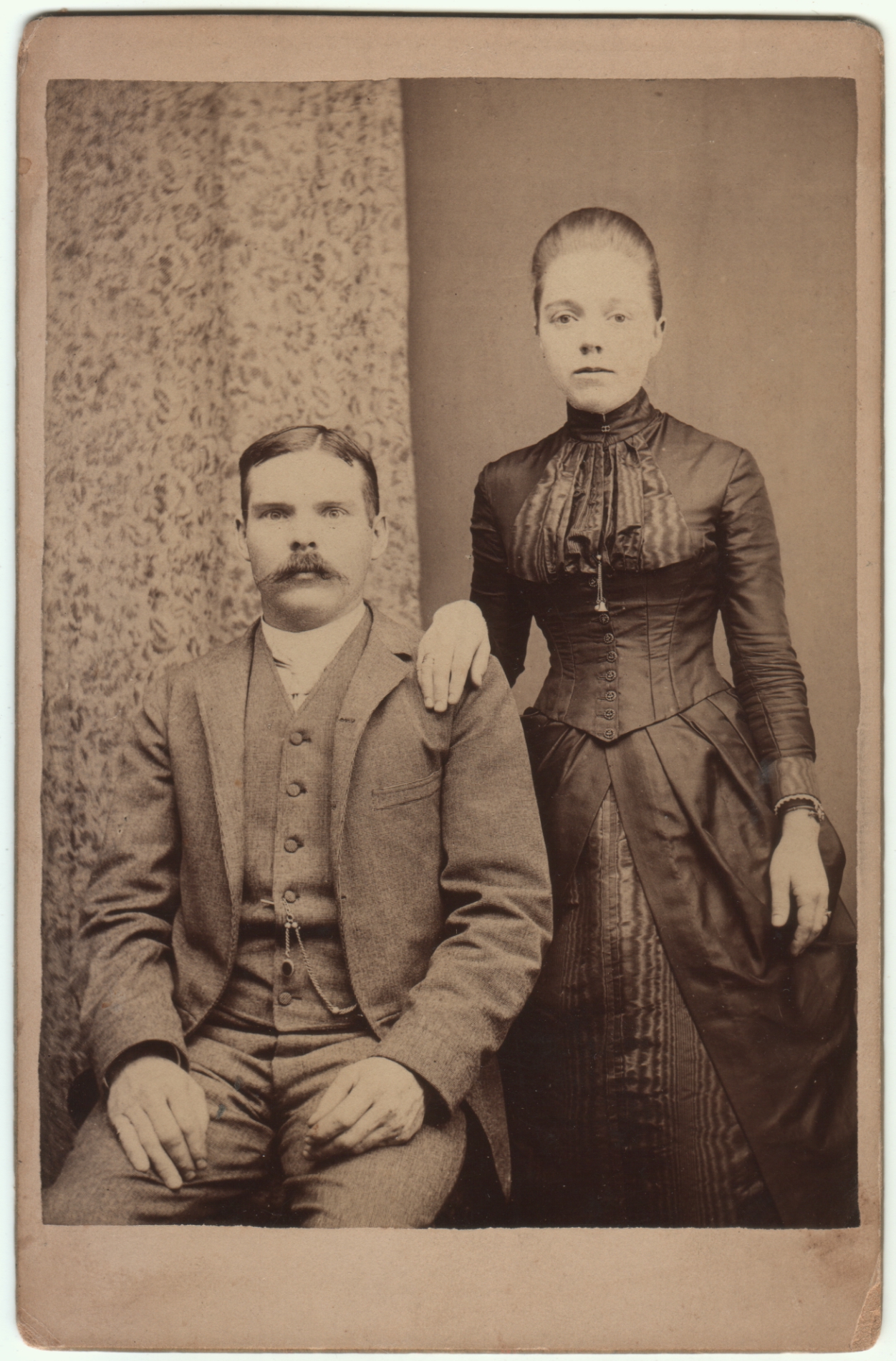 The simple cardboard backing makes me wonder if this is a draft copy. I keep thinking that woman looks like the corset is squeezing her body out the top of her head like a tube of toothpaste. I’m intrigued by the unfussy, almost modern (to my mind) way the drape rather neatly bisects the image, and the way the flowery pattern is backing the man. Not that he looks happy about it. Not that he looks like he’d be happy about much of anything.