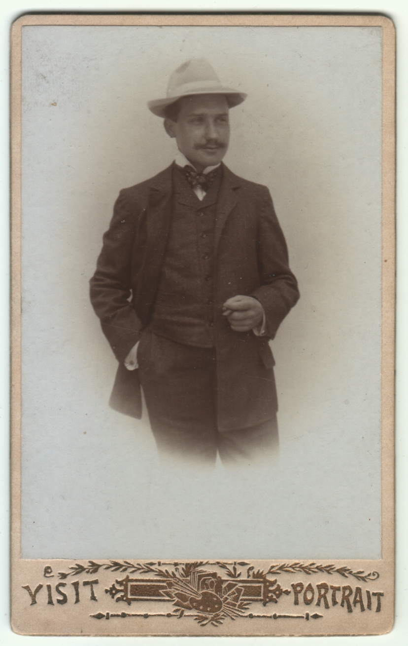 This one came in a bunch I bought on eBay that were advertised as pictures of men with great mustaches, or something like that. I thought it would be fun. (I was right.) They turned out to mostly be from around the turn of the last century, give or take a decade or so, and mostly from the old Austro-Hungarian Empire (which, of course, covers an enormous area, though in the case of my photos tends to focus on Vienna and Budapest, despite plenty of exceptions). So this one is a head-scratcher. It matches some of the others I bought with it, both in the style of the man pictured, and in the overall way it was put together, as a cabinet card the size of a CDV, with the gilt lettering and the slightly blue image. But it says “Visit Portrait”! (The back has a typically romantic design of flowers and cherubs with the word “Souvenir”, which can be English or French). “Visit portrait” is one possible translation of “carte de visite”. Is that what the words are referring to? Or is it some sort of actual souvenir card? If so, why in English? Are they catering to visiting Brits? Is English somehow considered romantic or chic on this card? Or perhaps this is actually a photo from England? But if so, why the awkward wording, as if a clunky translation? Why no photographer’s name anywhere? I don’t think I have any others like it, but surely it’s not unique in the world, so perhaps somebody will recognize it and be able to shed some light on it. Meanwhile, there’s this jaunty fellow to stare at and enjoy.