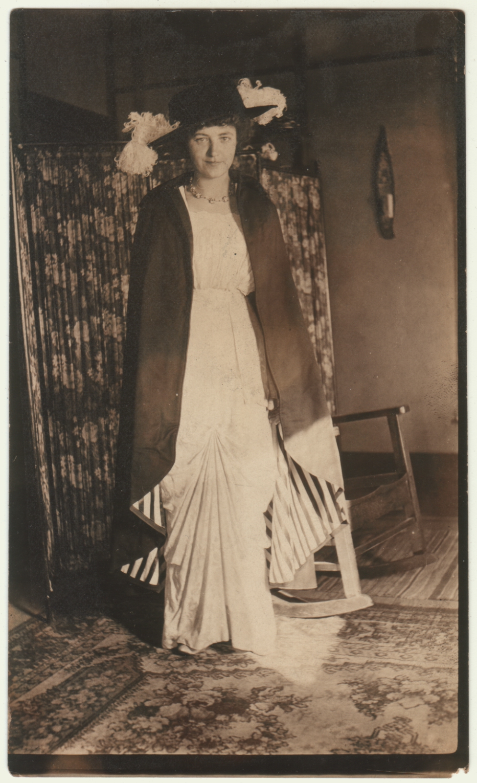 One of the advantages of being disorganized is that one is always having surprising discoveries. – A. A. Milne. I wholeheartedly subscribe to Milne’s maxim, as anyone who has ever seen my apartment can attest. But while the general disorganization of my photo collection can result in my observing interesting patterns and relationships, it sometimes results in things getting overlooked. Here is an example. Last week I posted a picture, and yesterday I found a different version of that same photo that had gotten separated and stored in a different box. *sigh* Normally, I might ignore this (and indeed, I have before), or I might try to pass it off as a deliberate curatorial choice, but let’s face it, I blew it, and I decided to show this other photo right away. I think they are so interesting to compare! The first one seems like the photographer was getting his/her bearings, and this second photo seems like the image as it was intended. What seemed in the first one like awkward lighting at her feet now comes across as a beautiful uplit fill. And wow, what a difference the lighting, angle, and expression make on her face! She’s perfectly attractive in both, but I had to look closely to make sure I was looking at the same woman, despite every other indication that it’s so. Of course, seeing this second photo gets us no closer to knowing her identify or the story behind this photo. It’s also interesting that the apparently flawed photo was printed up as a postcard, while this one is just a regular photo. It’s just as well that I made that mistake, since I might have posted the prettier photo without posting the flawed photo at all, and I think it’s good to see both.