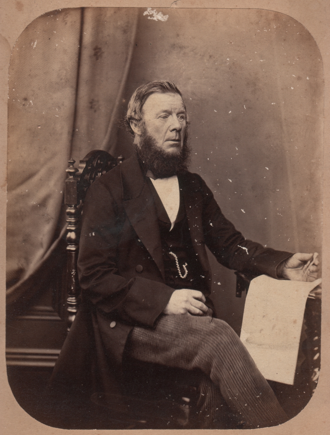 Part of what I love about this photo is its size. There are some pretty large photos in my collection, but few that are as old as this one seems to be. It’s mounted on some thin, brittle cardboard that itself seems to have been framed. Our gentleman here is holding some sort of compass, possibly the kind used in drafting, implying that he may be an architect or engineer, but more likely the caliper sort used in plotting distances on maps. It would help if the paper on the table were easier to see. If we are to believe that he is charting a course with a map, then what do we make of this? Is he an adventurous traveler? A sea captain or navigator? It’s hard to say since, to my eyes, he is wearing civilian clothes. Before we leave him, pause for a moment and behold that face. It’s a face with character. There’s something odd about his eyes, an unevenness that could mean several things. But it’s the face of a man who has seen much.