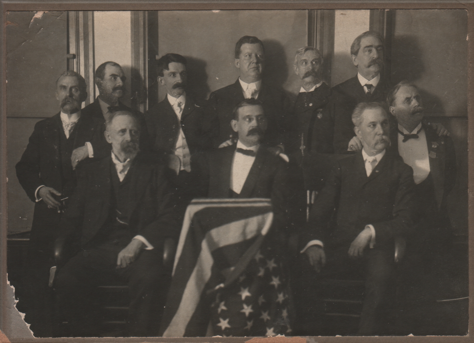 I don’t know who these guys are, or what they are doing here, but they certainly look important, or at least self-important. I like how the guy on the far left is posing for the camera regardless of whatever else is going on. Incidentally, correct flag etiquette demands that the flag never be used as decoration or drapery, never be fastened, never be displayed upside down except as a sign of distress, and never touch the floor. You know, just sayin’.