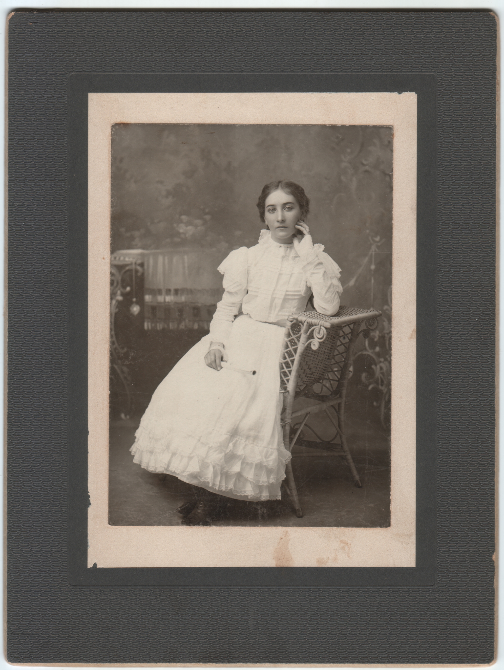 This is another one of the photos my mother gave me for my birthday.  I’m startled that, even though the notes on the back don’t quite agree on her name, they agree that she is 14.  I see it now, but she initially struck me as at least a decade older.  Maybe that just proves my contention that I’m terrible at guessing ages, but her face and posture have rather wise and weary qualities to them.  If she’s 14, does that tell us what the scroll is that she’s holding in her lap?