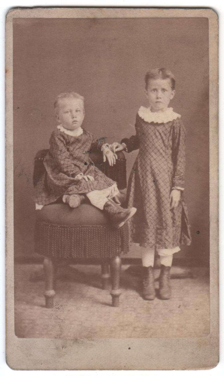 Here’s another one where the gender of the children is a little fuzzy, but I’m guessing they’re both boys this time.  Any thoughts on that?  It’s cute that they’re wearing matching outfits.  The beanpole on the right seems a little put off by this whole scenario, but the kid in the chair seems to be taking things in stride.  By the way, the design on the back of this CDV is unusually elaborate, so I’ve posted a scan of it here.  It’s especially impressive given how small the whole thing is.  UPDATE:  I just remembered that a comment on a previous post said you could determine a child’s gender in old CDVs by the way the hair is parted, and that the center part means the one on the right is a girl.  That completely throws my assumptions off, and it still doesn’t tell us about the one on the left.  Who knows, maybe I’m the only one who finds these kids confusing.