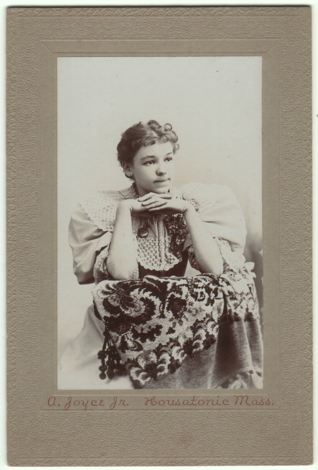 Wow, Housatonic Massachusetts, say that five times fast.  I’m a little puzzled by her jewelry.  Am I wrong in thinking that’s a pocket watch on a chain?  That seems like an odd fashion item for a girl, but maybe I’m wrong.  I was also thinking it looks like it’s hanging crooked, not to mention the fact that the chain looks like it’s slung under one arm like the strap of a satchel.  But I’m guessing I’m just not seeing it correctly.  Looking at it again, my second thought is that the chain is looped around her neck, but we can’t see it on her left shoulder because of the puffy sleeve, and that the watch may be pinned to her dress rather than hanging from the chain.  I’d be curious what others make of it.  Meanwhile, I think this is an adorable picture.  A whole novella can be read into the expression on her face.