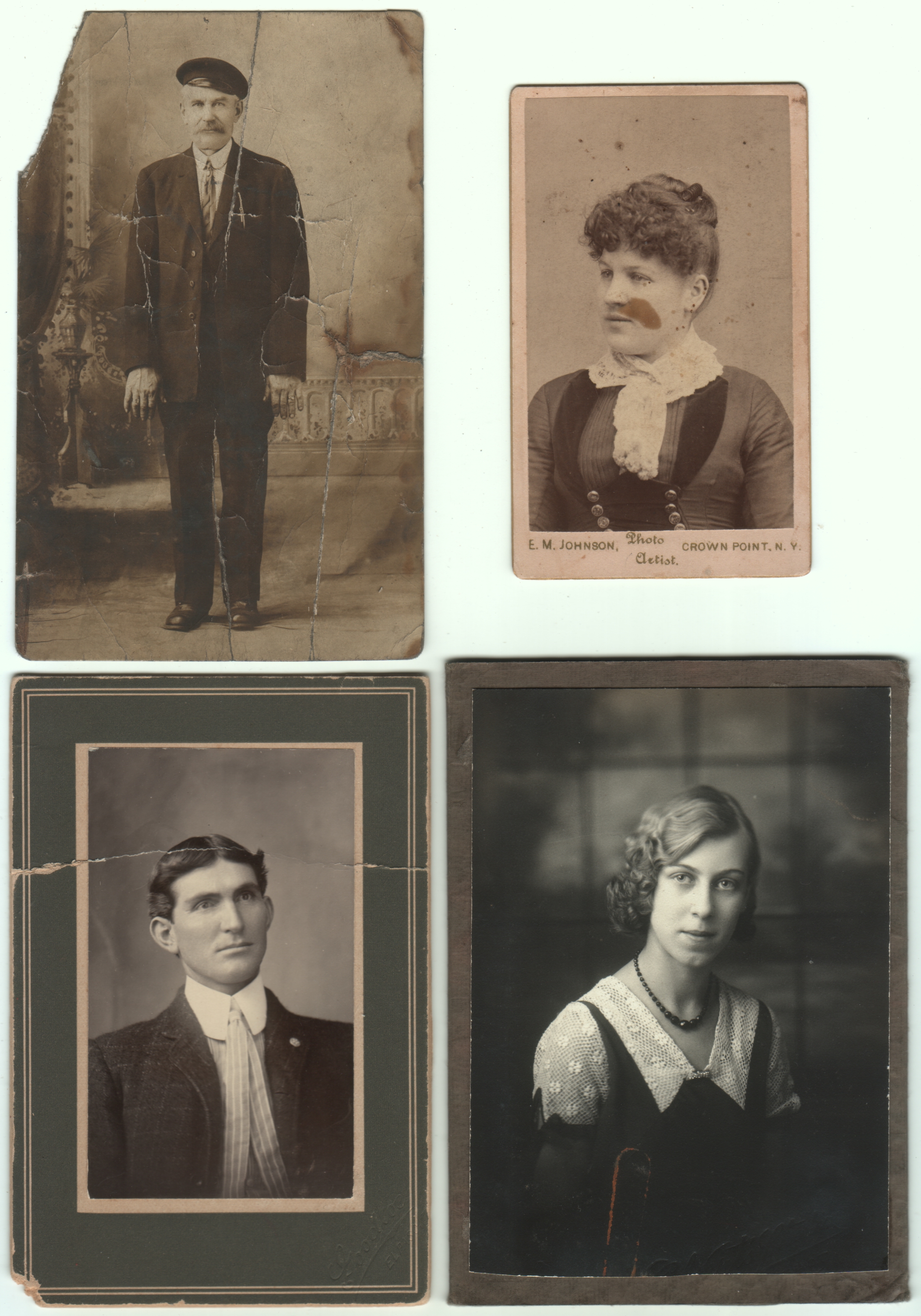 Top right photographer is E. M. Johnson of Crown Point, New York.  Bottom left photographer’s stamp is incomplete, but might be Goodloe of El Paso, Texas.  Bottom right photographer is Calvert’s Studio of Oregon City, Oregon.  Otherwise all undated and unidentified.