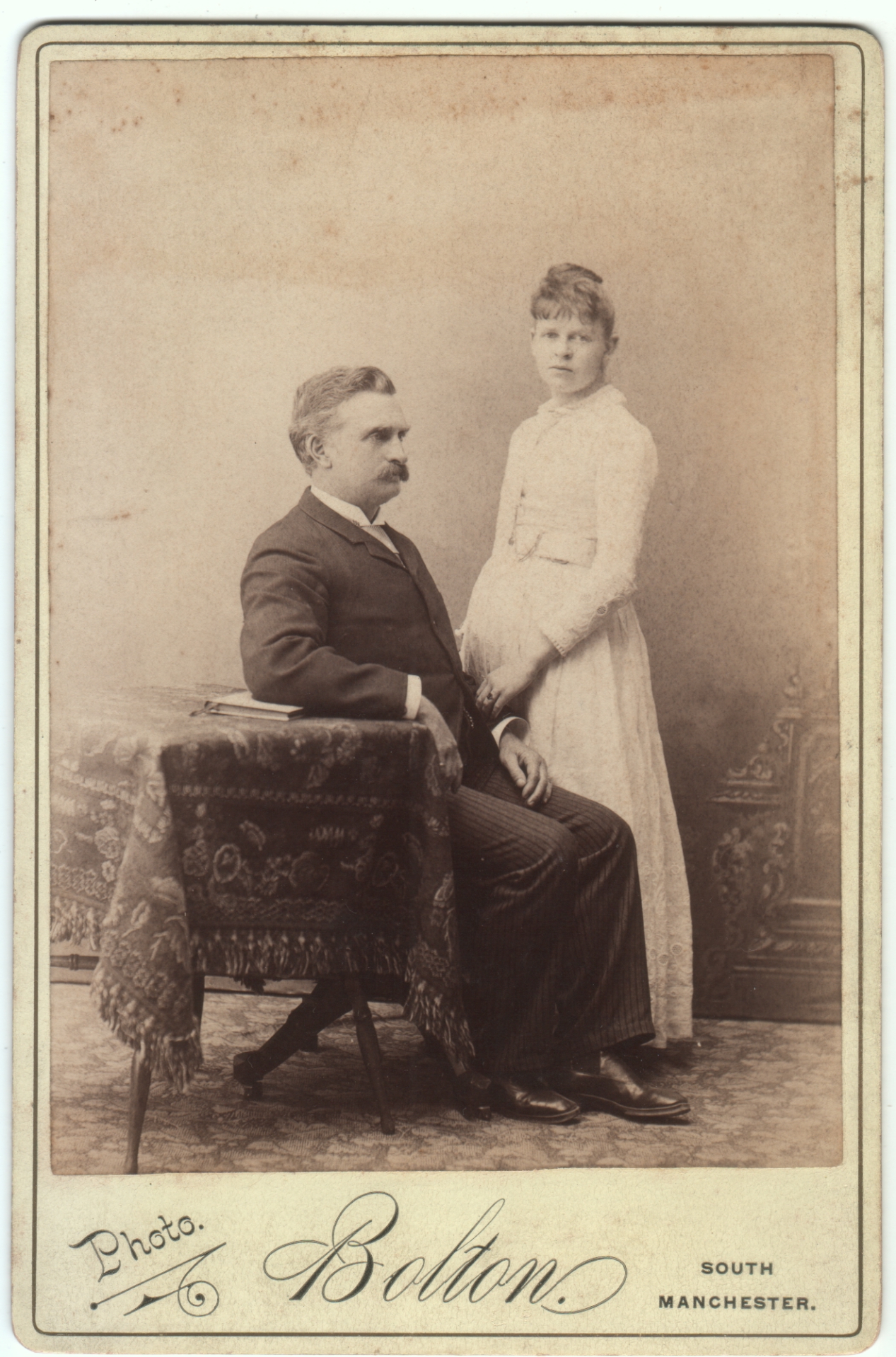 I was trying to determine if this is the Manchester in England (I think it is), and I found that Bolton is a town in Greater Manchester. So assuming Bolton is the name of the photography studio, and not just the location, I wonder if the studio was named after a person called Bolton, or if it was named after the town. What I find most intriguing is the identification on the back. Their pose suggests that they are husband and wife, but why call him “Uncle” when she’s just called by her first name? Is she perhaps a second wife? Maybe there’s a greater difference in age than I thought, and he’s a widower and she’s his daughter? Maybe I’m making more of it than necessary, but it caught my attention.