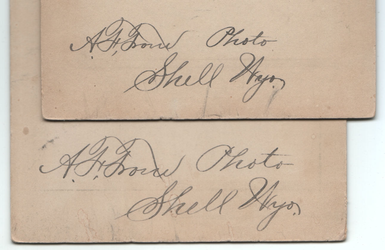 Both are from a photographer in Shell, Wyoming. The photographer’s name is handwritten, and I’m not certain I am reading it correctly. It appears to be A. F. Trow, but you can view the handwriting here to judge for yourself. Also written on the back of the right-hand photo in a different hand is For Robert.