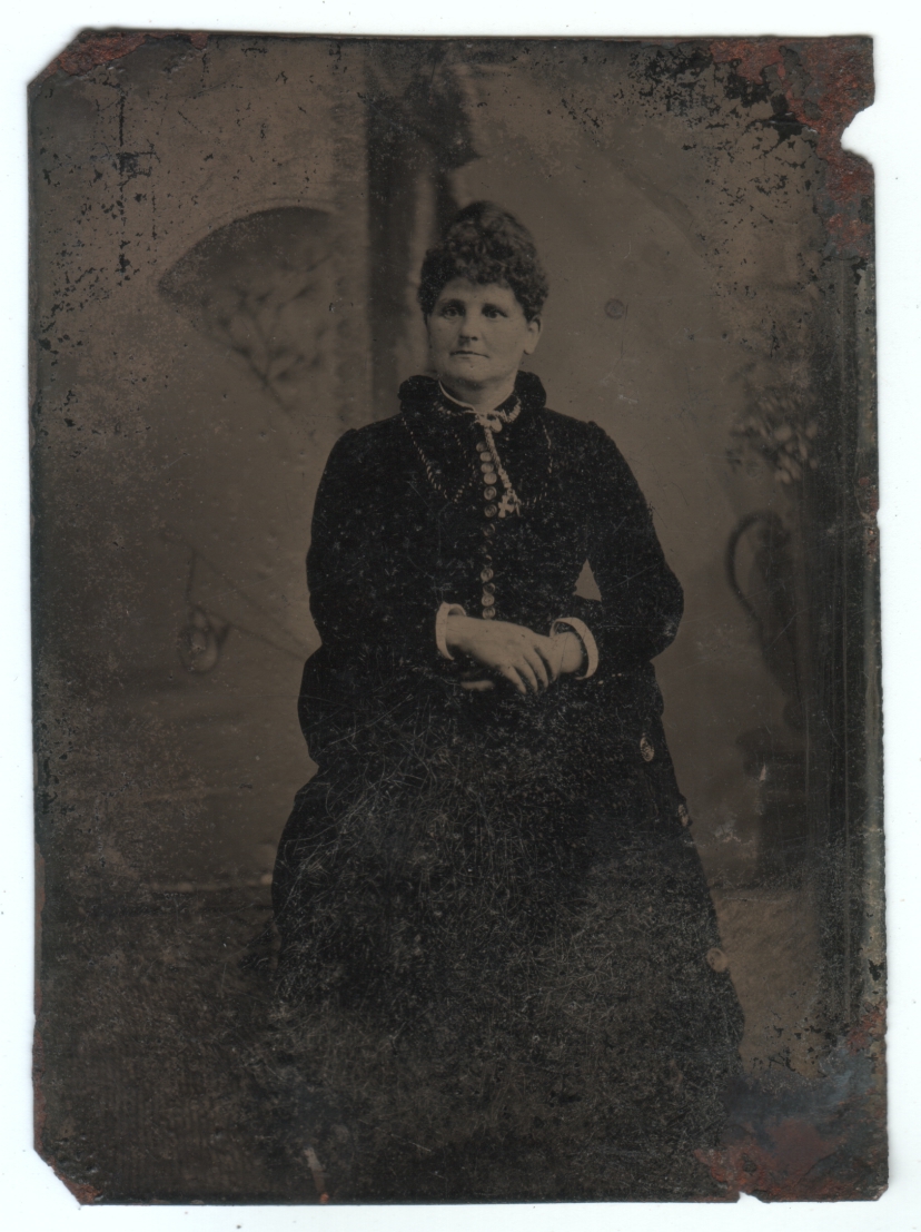 Tintypes are starting to grow on me. I think I still prefer photos on paper over photos on metal, but I seem to be getting over that. (I have a few other things, too, like ambrotypes, which are basically photos on glass, but I haven’t figured out how to make those look good in a scan.) So here we have another tintype that is rather beat-up and corroded, and a bit dark, which I find to be the case with the ones I have. It requires us to really concentrate to make out the image. But when we bother, this long-ago woman emerges before us, and we are rewarded for the effort.