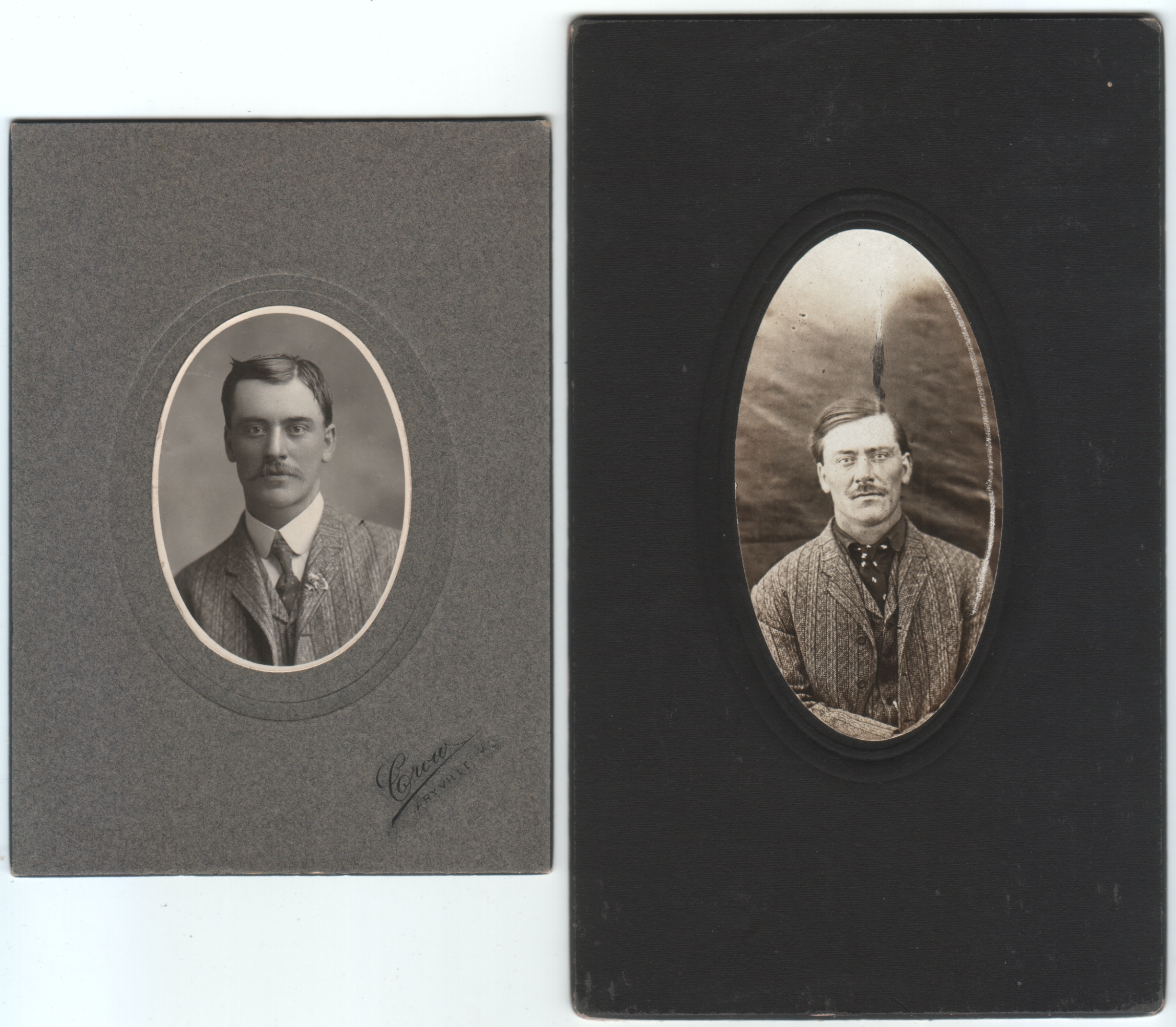 Three photos, ranging from 1.5 x 2.5 inches to 3 x 4.25 inches, mounted on cardboard frames/backings of different sizes.