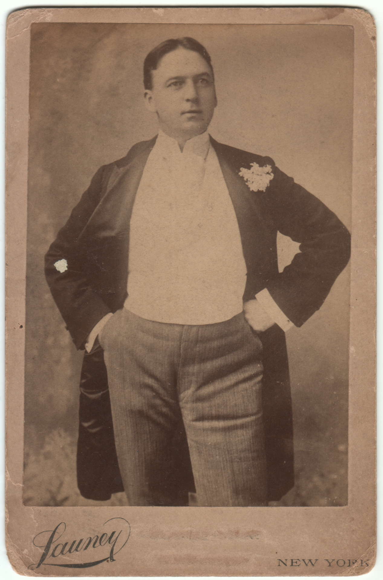 Once again, I find myself singing the praises of the internet. Not only does it let me buy antique photos, but it lets me research them once I have them. I’ve had this one lying around a while. It looked rather theatrical, literally, like the portrait of an actor or opera singer or something, especially given that it’s from New York. There’s also the clue of the two lines of scratched-out printing at the bottom, which I suspected was a name. Names on old cabinet cards are usually only printed when it’s a photo of somebody notable being published. So I finally decided to try to figure out who this guy is. I did a Google image search on “Launey cabinet card”, and it wasn’t long before this exact image showed up in undamaged form, revealing that the deleted words are Chauncey Olcott / “The Irish Tenor”. (The white spot on his elbow is just additional damage.) Though billed as “The Irish Tenor”, Chancellor “Chauncey” Olcott (1858-1932) was actually born in Buffalo, New York. He was a Broadway star, a singer and actor, but also a notable songwriter. Perhaps his most famous song was “My Wild Irish Rose”, and a 1947 Hollywood biopic with Dennis Morgan as Olcott was titled after the song. Olcott died, one hopes with some flair, in Monte Carlo. The remaining mystery of this photo is why somebody would have obliterated the name.