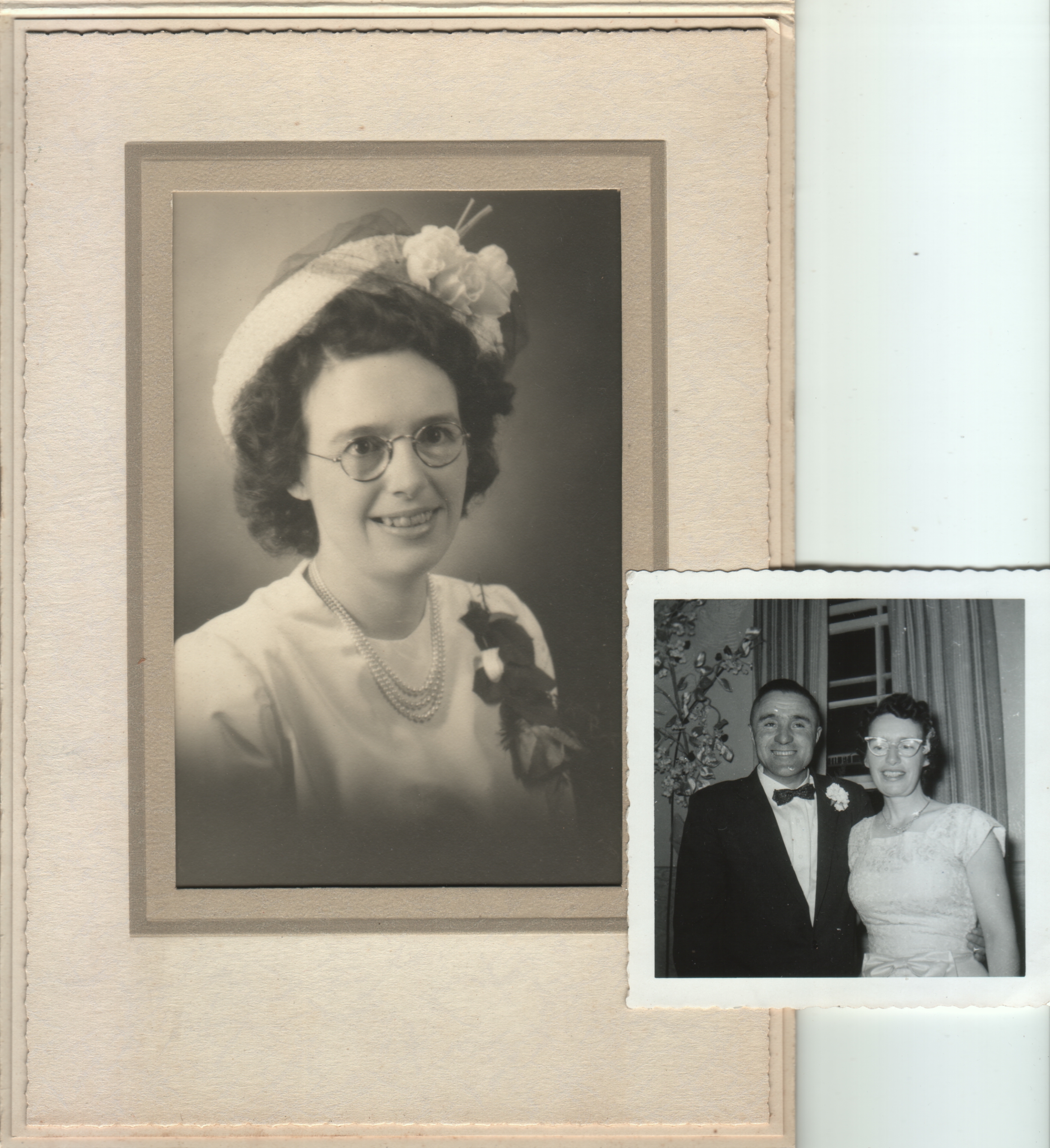 Written on the back of the cardboard frame is Oriole Rasmussen.   Written on the back of the snapshot is Oct. 7, 1958. Oriole Rasmussen and new husband Bob Brownmiller
