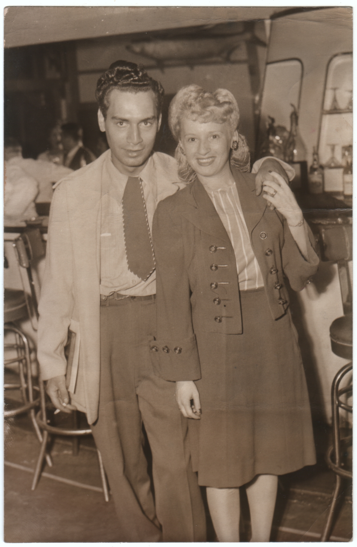 I was in the mood for something a little newer, so here you go.  What a classic 1940s look, right down to her snood.  Check out the edges of his tie!  But, of course, the longer I stared at this photo, the more I started questioning what I was looking at.  What’s up with the wall behind her, that weird panel to the right that’s leaning at a precarious angle?  It looks like it’s painted to look like the wall of a bar, with shelves of glassware.  Could that be?  Is that some sort of odd decoration, a bar that paints pretty glassware displays because it’s too cheap to afford the real thing?  Then suddenly I wondered if this is a movie set or something.  Would that explain the notebook thing he’s carrying under his arm?  Oh, I’m probably letting my imagination run wild.  I have another photo of a blonde in a bar that I think is this same woman several years later, implying that this isn’t a one-time occasion for her, but a pastime she periodically gets photographed engaging in.  Well, whoever they are, and wherever they are, and whatever they are to each other, they seem to be having a good time, and that’s good enough for me.